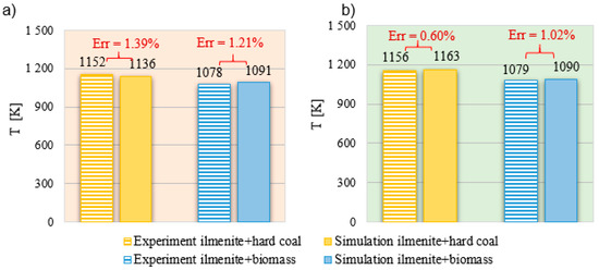 The AR’s average temperature in both experiments with hard coal and wood chips was similar and amounted to 1152 K and 1156 K, respectively. In the FR, the average temperature in both experimental tests was similar and equal to 1078 K and 1079 K, respectively.