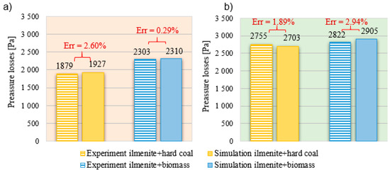 The highest dense fluidized bed in the FR, i.e., 0.39 m, was observed during ilmenite experiments with biomass. Therefore, in this case, the pressure drop was the highest and amounted to 2822 Pa. The second highest dense fluidized bed in the FR, equal to 0.38 m, was noticed for ilmenite with hard coal CLC combustion. The pressure drop was 2755 Pa, in this case.