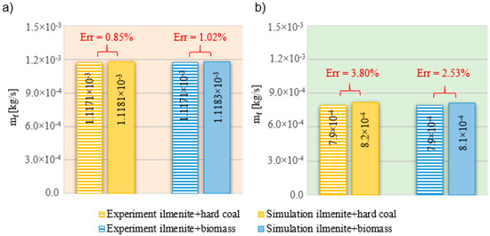 The first attempts to validate the CLC model for ilmenite using the CeSFaMB simulator were presented in other studies [3,27]. This paper shows numerical simulations with the latest version of the CeSFaMB 4th generation for biomass and coal CLC combustion with ilmenite oxygen carrier. The CLC model’s validation includes such parameters as the average temperature in the reactors, pressure drop in the fluidized bed, void fractions, gas mass flow rate, superficial gas velocity, and primary emissions: CO2, O2, NOX, SOX.