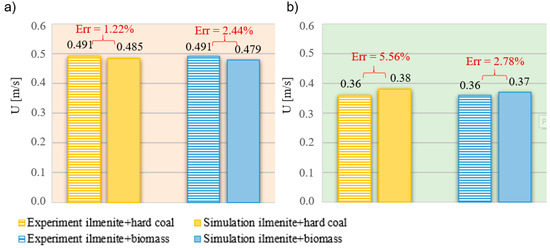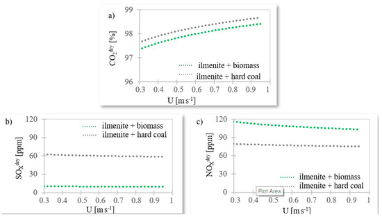 The increase of superficial gas velocity in the FR causes a significant increase in CO2 emissions, shown in Figure 18a. Since CO2 constitutes the FR’s fluidizing gas, it dilutes other flue gas components, leading to the decrease in SOX and NOX emissions, shown in Figure 18.