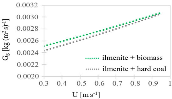 The increase in superficial gas velocity in the combustion chamber causes the increase of the solids circulating rate in both cases. The following equations describe these correlations: