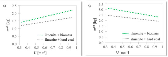 The total mass of solids in the fuel reactor (a) and air reactor (b) versus the superficial gas velocity in the FR.