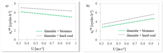 The number of ilmenite cycles in reactors versus superficial gas velocity in the FR (a) AR; (b) FR.