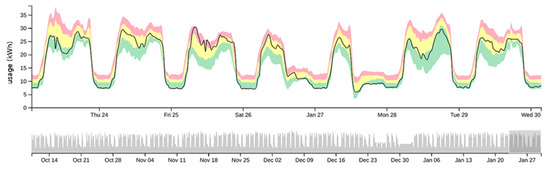 Figure 1 shows the diagnostic report provided by the EDI-Net dashboard as a tool for expert users (though it is available for all users). Actual measured usage is shown as a black line and the baseline model predictions are represented as coloured zones. When interpreting these reports, the key thing to note is where the black line falls relative to the coloured zones. If the black line is within the yellow ‘normal’ zone, then the building is operating as expected. If the black line persistently falls within or goes beyond the red or green zones, then there may be a problem worth investigating. With practice, this can be interpreted intuitively.