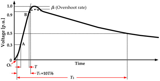 The crucial problem in the lightning impulse voltage tests on the transformer and reactor winding is the adjustment of the test voltage waveform according to the standard requirement. As shown in Figure 1, the front time (T1), time to half (T2), and overshoot rate (βe) will be in the ranges of 1.2 μs ± 30% (0.84 μs to 1.56 μs), 50 μs ± 30% (40 μs to 60 μs), and less than 5%, respectively [1,2,3,4,5].