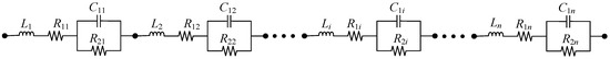 For the equivalent circuit identification, the impedance of a transformer or reactor winding was measured throughout the frequency range from 10 Hz to 10 MHz. The vector fitting [14] was employed to extract the equivalent circuit by matching the model impedance with the measured one. The equivalent circuit is composed of several series sets of RLC circuits, as shown in Figure 4.