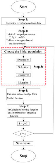 The genetic algorithm is a random-based classical evolutionary algorithm, which is often used for solving the constrained and unconstrained optimization problems. A simple genetic algorithm [15,16] applied in this paper relies on the process of natural selection, which is composed of reproduction, selection, crossover, and mutation. In this paper, parameter estimation based on a genetic algorithm (GA) [15,16] is employed to search for the most appropriate circuit parameters, in which the impedances of the transformer or reactor winding from calculation using the equivalent circuit model and experiment are matched. The objective function (Ob(X)), which the genetic algorithm uses in the minimization, is shown in Equation (14).