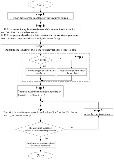 The flowchart of the proposed approach is presented in Figure 8. In steps 1 and 2, the proposed approach is initiated from the identification of the realized equivalent circuit of the considered winding, as presented in Section 2. Then, the generator circuit is selected from the criteria of the low frequency inductance (LL), which can be determined from the impedance in the low frequency range from 1 kHz to 5 kHz. When LL is less than 15 mH, the Glaninger circuit, as shown in Figure 3, will be recommended to represent the generator circuit [7]. For other values of LL, the conventional circuit in Figure 2 will be selected as the generator circuit. From the identified equivalent circuit of the winding and the selected generator circuit parameters, the circuit simulator is utilized to compute the generated waveform, and the waveform parameters are evaluated according to the standards, IEC 60060-1 [1] and IEC 61083 [17,18,19,20]. If the waveform parameters are not in accordance with the standard requirement, the circuit parameters of the generator circuit will be adjusted until the waveform parameters are required by the standard are obtained. The determined generator circuit parameters are employed in the actual lightning impulse voltage tests.