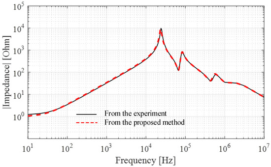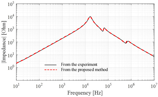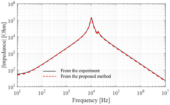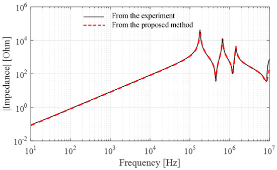 In this case, a power transformer (60 MVA 115 kV/24 kV) was considered. With the proposed approach, the equivalent circuit of a 24-kV winding was extracted. The number of RLC sets was four, as shown in Figure 9. The realized circuit parameters are expressed in Table 4. The good agreement between impedances from the experiment and the equivalent circuit model are observed and shown in Figure 16 and Figure 17.