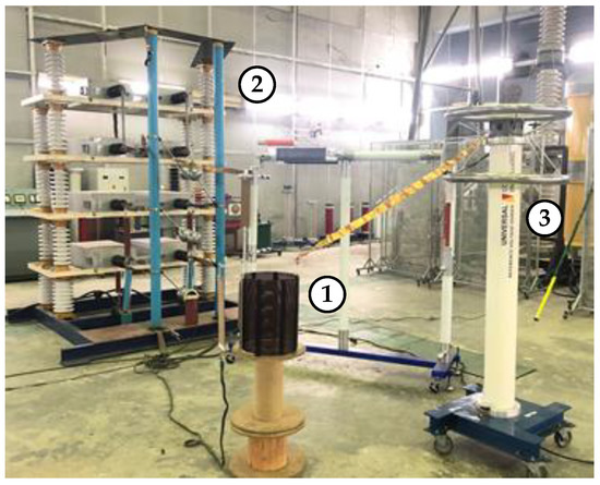 Experimental set up of the completed test system for the lightning impulse test of the distribution transformer winding, where (1) is the transformer under test, (2) is the impulse voltage generator, and (3) is a voltage divider.