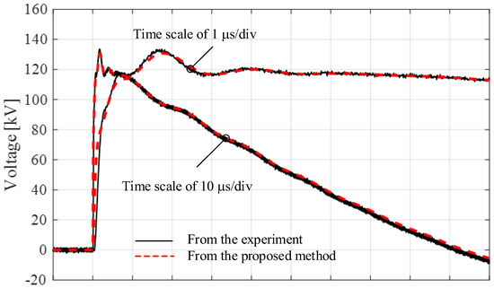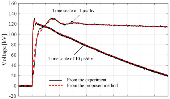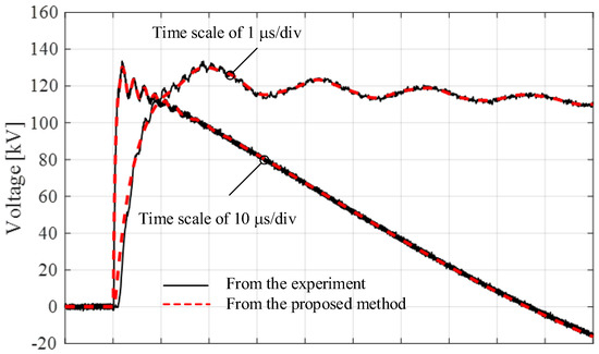 Comparison of the generated impulse voltage waveforms collected from the experiment and computed by the proposed method.