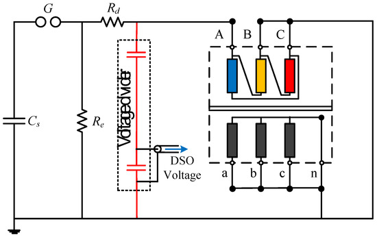 Equivalent circuit of the completed test system for the lightning impulse test of the distribution transformer winding.