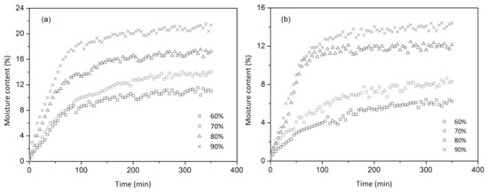 Moisture adsorption of: (a) pellets made from untreated straw; (b) pellets made from steam exploded straw treated at 200 °C for 10 min, under condition of 30 °C and four levels of relative humidity.