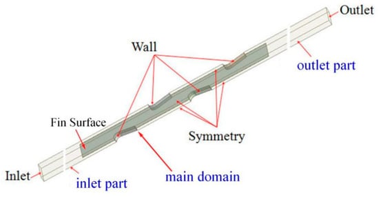 In this model, the material of the heat exchanger was aluminum, of which the physical properties were given as: , , . The material of the working fluid was air, of which the physical properties were given as: , , , . In order to pursue an efficient calculation, the computational model considered was a periodic model, seen as in Figure 2. Figure 2 shows the detailed boundary conditions of the computational domain.