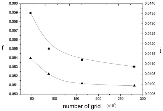 Larger numbers of grids would occupy larger CPU resources which means more time for calculation. Meanwhile, smaller numbers of grid would lead to larger difference between numerical and the experimental results. Thus, a reasonable grid number was necessary to guarantee CPU operation speed and acceptable difference. In this paper, four different numbers of grids, including 490,628, 840,365, 1,584,653, and 2,794,732 elements, were considered to evaluate, as seen in Figure 3. The results showed that the average j factor and f factor of the 1,584,653 mesh elements varied from that of the 2,794,732 mesh elements by less than 2% and 1.08%, respectively. Therefore, the mesh with 1,584,653 grid elements was adopted to conduct the numerical simulation. Moreover, the grid independence of the other cases was also tested.