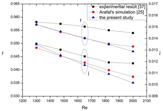 The present simulation results were validated by Wang’s experiment [35] and Arafat’s simulation [25], as shown in Figure 4, which revealed the comparison of numerical and experimental f factor and j factor for the plate fin-tube heat exchanger. The boundary conditions of Wang’s experiment and Arafat’s simulation were presented as the same as in this paper. The simulation was conducted by k-ε-enhance, and the k-ε-enhance had a good agreement with the experimental results of the f factor. Moreover, the resistance between fluid and solid was considered, and the thermal resistance value was set as . The procedure had been discussed in detail in the published article [36]. Some reasons accounted for the difference between the experiment and the simulation: the working fluid was in a single phase, and their properties remained constant and smooth surface conditions were adopted in the simulation. Additionally, the difference of the j factor and f factor between the Arafat’s simulation [25] and the present numerical results was less than 3.82% and 4.90%, respectively. The difference of the j factor and f factor between the experimental results and present simulation results by k-ε-enhance model was less than 7.6%. It can be observed that the present simulation had good agreement with Arafat’s simulation [25] and Wang’s experimental results [35].