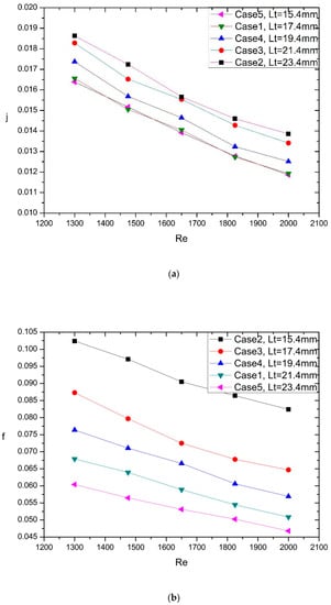 In this section, three parameters, including transversal tube pitch Lt, longitudinal tube pitch Ll and angle , were respectively considered as single variables to research the effect on the thermal hydraulic performance. The discussed ranges of these geometrical parameters were 15.4–23.4 mm (transversal tube pitch), 16–24 mm (longitudinal tube pitch), and 40–80° (angle), respectively.