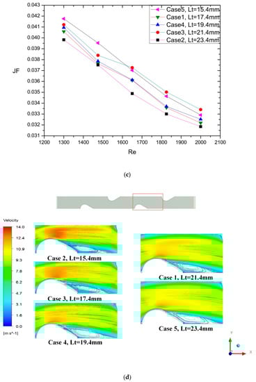 As seen in Figure 5a,b, with the increase of the transversal tube pitch, the j factor was increased. Case 2, Case 3, and Case 4 had a 13.89%, 11.1%, and 4.45% higher j factor and 55.45%, 25.61%, and 11.99% higher f factor, when compared with the Case 1, respectively. Besides, compared with Case 1, Case 5 had a 0.26% lower j factor and 9.64% lower f factor. Clearly, the transversal tube pitch had great influence on the f factor than the j factor. Yet, as seen in the Figure 5c, the increase rate of the JF factor was less than 4%. Compared with Case 1, Case 2 had a 1.67% lower JF factor. Case 3, Case 4, and Case 5 had a 2.97%, 0.58%, and 3.17% higher JF factor than Case 1, respectively. Figure 5d revealed the flow field of different transversal tube pitches.