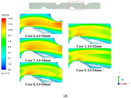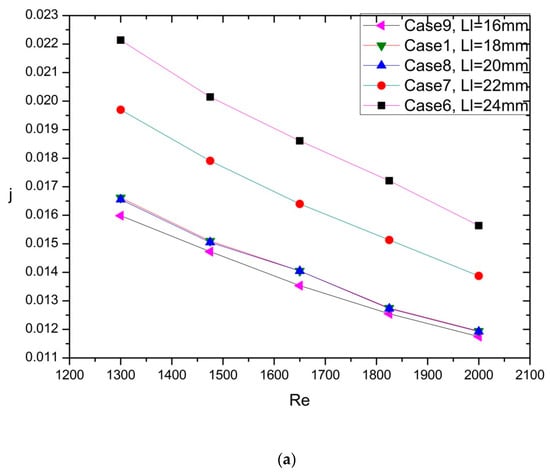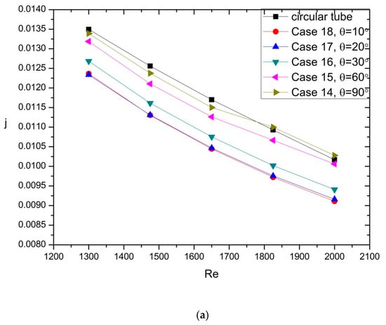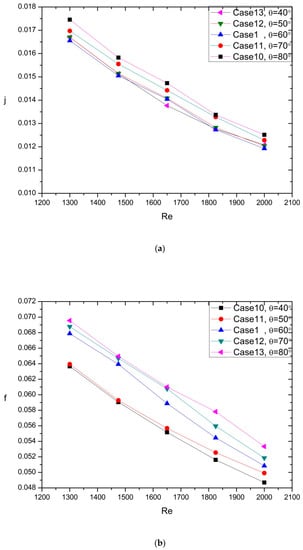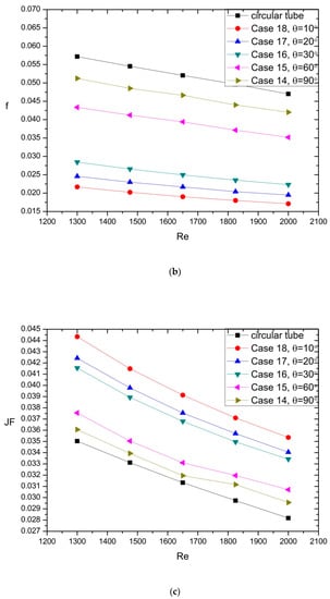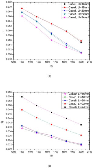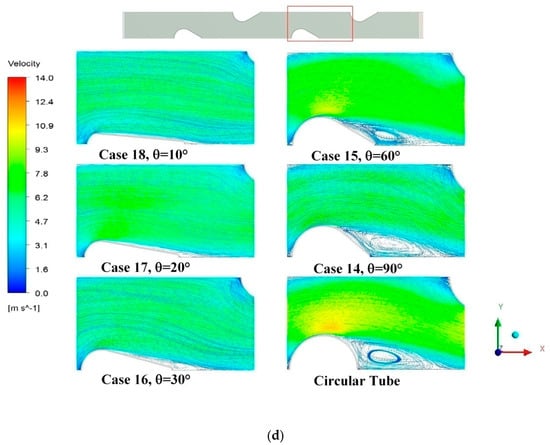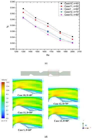 As seen in Figure 7a–c, Case 10 and Case 11 had 5.92% and 4.77% lower f factor and 5.08% and 3.17% higher j factor, which led to 7.24% and 4.87% higher JF factor when compared with Case 1, respectively. Besides, Case 12 and Case 13 had 2.1% and 3.75% higher f factor than Case 1, but the j factor of Case 12 and Case 13 was a little lower than that of the Case 1. Eventually, the JF factor of Case 12 and Case 13 was 0.01% and 1.01% lower JF factor than that of Case 1. The flow field of different angle as the radius remained constant can be observed in Figure 7d.