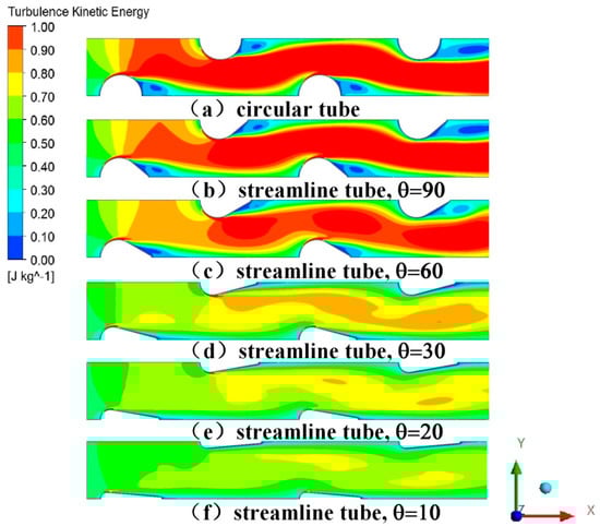 When the angle became smaller, the heat exchange area was increased with the increasing of the tube cross section perimeter. Besides, the wake region became smaller as the angle increased and it was beneficial for the enhancement of heat transfer performance and improvement of fluid flow characteristics. Obviously, decreasing the angle was not only beneficial to enhance the thermal performance, but also helpful to improve the flow characteristics.