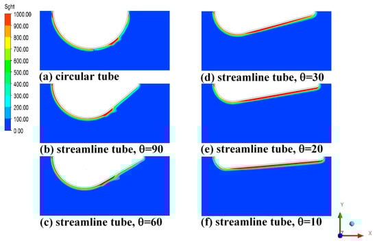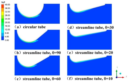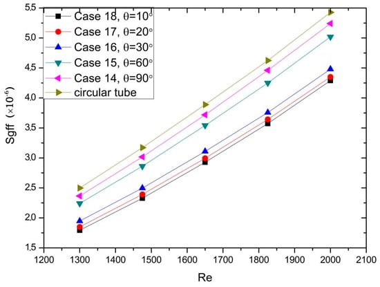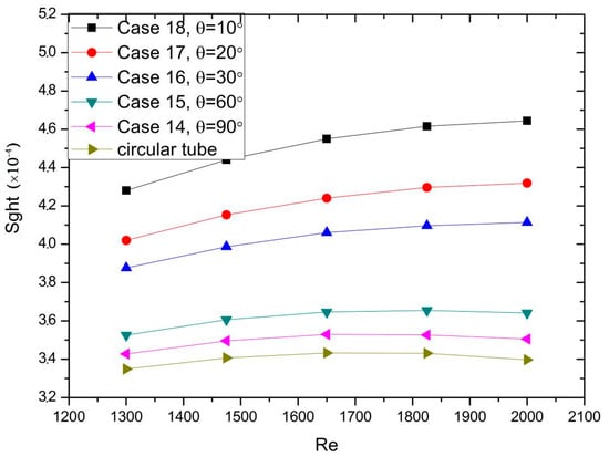 The thermal entropy generation is an index to reflect the irreversibility of heat transfer from high temperature object to low temperature object. Actually, in the heat exchanger, the heat is transferred from high temperature object to low temperature object, and this endeavor was done to enhance the heat transfer efficiency. Thus, greater thermal entropy generation indicates better heat transfer performance [37]. As it can be seen in Figure 12, the main thermal entropy generation was concentrated around the tube. The thermal entropy generation of the circular tube was mainly focused on the first half of the tube, while in the second half of streamline tube, the thermal entropy generation gradually increased with the decrease of angle. Figure 13 showed the effect of different angle on Sght at different Reynolds numbers. It can be seen in Figure 13 that Case 14, Case 15, and Case 16 had 2.75%, 6.21%, and 18.31% higher Sght than the circular tube, respectively. Besides, Case 17 and Case 18 were 23.57% and 32.40% higher Sght than the circular tube, respectively. It can be observed that the streamline tube had higher thermal entropy generation than the circular tube, and with the decrease of angle, the thermal entropy generation was gradually increased.