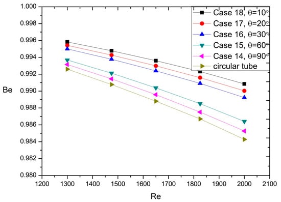 In order to quantize the contribution of each term in the total irreversibility, the Bejan number was considered. Figure 14 showed the effect of different angle on Be at different Reynolds numbers. It can be found that the contribution of the thermal entropy generation was much higher than that of the frictional entropy generation. Besides, with the decrease of the angle, the frictional entropy generation decreased, and the thermal entropy generation increased. Thus, the total entropy generation was more affected by the latter, resulting in a higher Bejan number, as seen in the Figure 14.