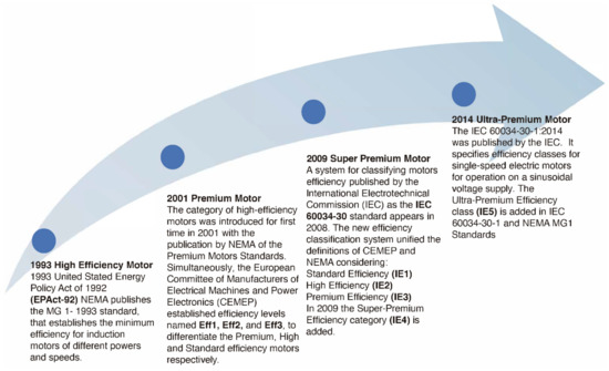 Electric motors are currently classified in terms of efficiency. This classification has been the result of various policies and regulations proposed in developed countries since the last decade of the 20th century. A summary of the evolution of the efficiency classification of electric motors can be seen in Figure 1 below, which illustrates that, finally, in 2008, a classification system of electric motor efficiency was published by the International Electrotechnical Commission (IEC) as the IEC 60034-30 standard. This standard unified the definitions of the European Committee of Manufacturers of Electrical Machines and Power Electronics (CEMEP) and the National Electrical Manufacturers Association (NEMA), establishing the following efficiency classes: IE1 (Standard Efficiency), IE2 (High Efficiency) and IE3 (Premium Efficiency); IE4 (Super Premium Efficiency) was added in 2009. It also proposed nominal limits for the latest efficiency class, IE5 (Ultra Premium Efficiency), which was added in 2014. The motor of efficiency class IE5 is reserved for a very high-efficiency design and is compatible with other commercial technologies such as synchronous reluctance motors (SynRM) and permanent magnet synchronous motors [3,7,8].