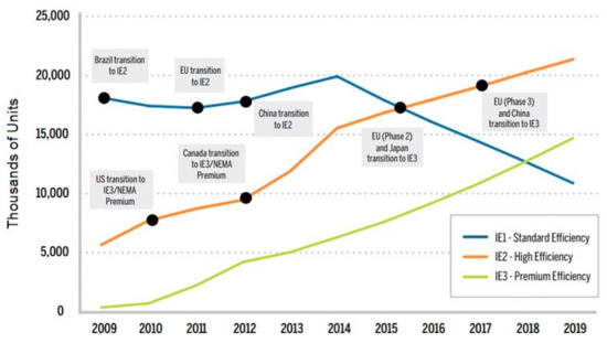 On the other hand, the acknowledgment of the great potential for a reduction in electricity consumption and corresponding emissions results from the improving efficiency of electric motors systems, has led to the introduction of regulations imposing minimum energy efficiency levels for new electric motors in all major economies [4]. For these strategies, there is pressure in the market imposed by legislation that establishes deadlines for the commercialization of standard-efficiency motors that guarantee a gradual advancement in the efficient use of energy. Because of this, energy efficiency standards and labeling have been implemented in many countries and are being developed in other countries [3,7,9,10,11]. These minimum efficiency requirements and Minimum Energy Performance Standards (MEPS) are powerful tools to transform the market, causing a decline in sales of IE1 class motors while sales of IE2 and IE3 motors are steadily increasing, as shown in Figure 2 [12].