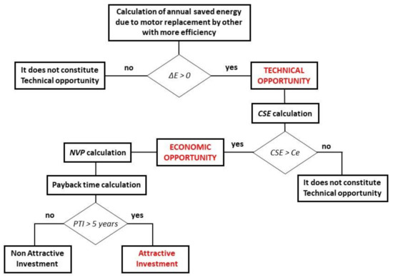 When analyzing the use of more efficient motors to replace others in operation, the opportunities for technical and economic potential are determined by assessing the calculation of potential energy savings and the CSE. Company proposals to replace motors must be analyzed individually. This article provides a complete methodology to identify existing technical and economic options at this facility. The strategy presented in this paper is based on an a priori preliminary assessment to determine the economic opportunities. The proposed methodology distinguishes which motors to evaluate and avoids evaluating all motors in the facility. In contrast to the literature reviewed, where the simple payback period is mostly used, in this paper, we propose to perform a complete economic analysis and calculate the payback period for the investment considering the discount rate from the results of the preliminary evaluation in which the CSE is calculated. In this sense, the principal problem shown in the literature reports regarding the identification of economic opportunities has been solved.