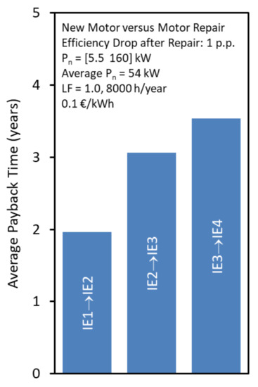 Average payback time for buying a higher efficiency motor vs. motor repair. Reproduced from [14], Institute of Electrical and Electronics Engineers (IEEE): 2018.