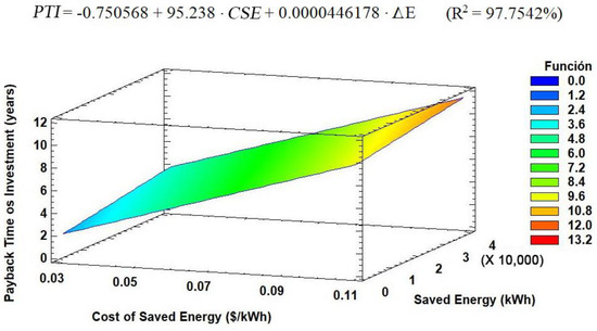 Figure 6 shows the surface that represents the behavior of the NPV. Once the NPV and the PTI have been correlated with saved energy (ΔE) and with the CSE, there are valid expressions for that facility that allow these indicators to be estimated quickly.