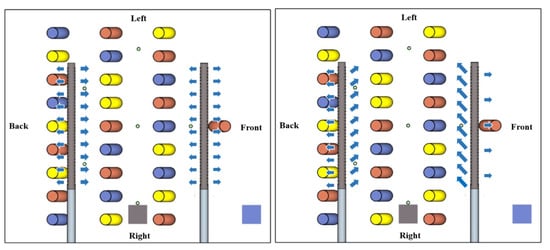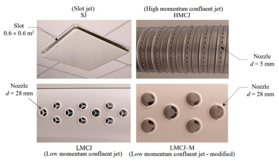Four mixing SJ supply devices are installed in the room, see Figure 2, and each has a rectangular outlet (0.6 × 0.6 m2) overlaid with plate to make an all-round slot of 0.02 m that issues a ceiling-attached airflow jet. All CJ supply devices were circular channels (0.25 m diameter and 4 m long) mounted 0.05 m below the ceiling level and consisted of different nozzle configurations to distinguish their classifications as HMCJ, LMCJ and LMCJ-M (refer to Figure 1), see Table 1 for specifications. The HMCJ had 576 nozzles (d = 0.005 m) at each horizontal side of the channel with a horizontal spacing of 11 jet diameters and a vertical spacing of 4 jet diameters. The LMCJ had 114 nozzles (d = 0.028 m) placed in three lines with 38 nozzles each and the middle line was slightly offset on each side of the channel, the horizontal spacing was 3 jet diameters and the vertical spacing was 1 jet diameter, see [31] for more details. The HMCJ and LMCJ directed the airflow jets in the front and back directions of the room, as shown in Figure 3 (left). The LMCJ-M is the same supply device as the LMCJ but was modified by blocking half of the nozzles on one side and re-directing airflow from some nozzles away from the outlet, as shown in Figure 3 (right). The placement of the inlets, outlet and mannequins is based on a previous field-study at a local school were the LMCJ were evaluated with varying airflow rates in a real classroom situation [41].