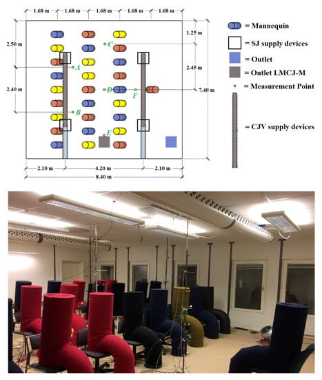 Set-up of measurement points and mannequins. (Top) Measurement points and placements of SJ and confluent jet devices, red mannequins were turned on for the 10 p (persons) cases, red and blue were turned on for 19 p cases and red, blue and yellow were turned on for the 28 p cases. (Bottom) Photo of set-up.