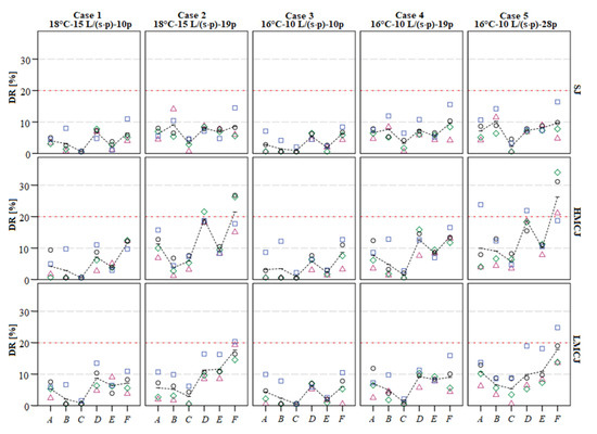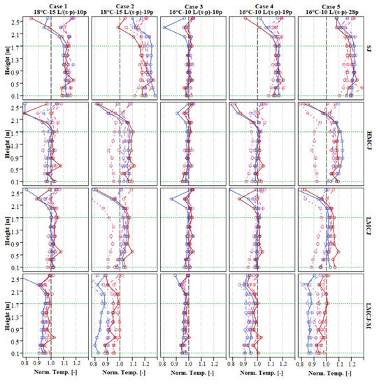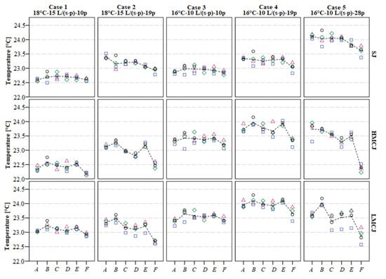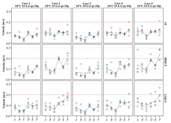 As one can expect, the temperature profiles in Figure 6 are the inverse of the LHRE. All supply devices have small vertical temperature gradients (VTG) <0.8 °C. Which are quite small in terms of thermal comfort, although LMCJ have slightly higher VTG than HMCJ and SJ in the high airflow Cases 2 and 5, which indicates slightly more stratified conditions and more of a hybrid system than a MV system. The SJ has very homogenous temperature conditions for all five cases and the Tavg is highly dependent upon the occupancy density. For all three supply devices, the Tavg increases by 0.4 °C for TS = 16 °C cases when the occupancy density is raised from 10 p to 19 p. For Case 5, which has highest occupancy density, the Tavg increases for the SJ (+0.7 °C) because of lower LHRE, but the Tavg drops by 0.3–0.4 °C for HMCJ and LMCJ because of the higher velocities in the occupied zone, mostly in points close to the front of the room (D–F).