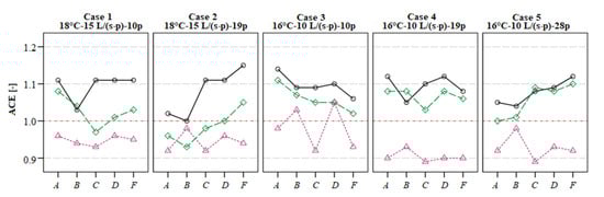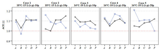 There are some similarities between LHRE and ACEP, compare Figure 5 and Figure 7. SJ both have the lowest LHRE and lowest ACEP although there is more variation between points (A–D and F) for ACEP than for the LHRE. HMCJ and LMCJ have comparable ACEP for the three cases with 16 °C supply temperature, with a slightly higher ACEP for the LMCJ. HMCJ performs worse when the supply temperature is raised to 18 °C compared to LMCJ but still has a higher average ACEP than SJ. LMCJ is somewhere between a DV system and a MV system, hence LMCJ acts like a hybrid system in terms of ACEP, whereas the HMJC is closer to a MV system, possibly due to higher mixing occurring because of higher nozzle-distance-to-diameter-ratio.