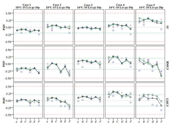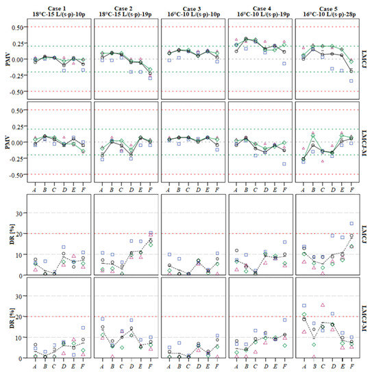 Thermal comfort (PMV and DR) at points A–F for LMCJ and LMCJ-M @ □ = 0.1 m, ○ = 0.6 m, ◊ = 1.1 m, ∆ = 1.7 m, –––– = thermal Comfort for standing person, –––– = thermal comfort for seated person. - - - - = limits for class B ISO–773, - - - - = limits for class A ISO-7730, RH = 35%, CLO = 0.9, and MET = 1.1. Note: the lines/mean does not represent a gradient, it is only a comparison between points.