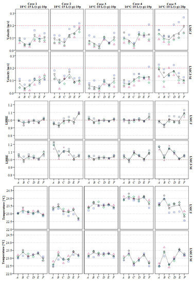 Velocity, LHRE and temperature at points A–F for LMCJ and LMCJ-M @ □ = 0.1 m, ○ = 0.6 m, ◊ = 1.1 m, ∆ = 1.7 m and ---- = mean. Note: the mean does not represent a gradient, it is only a comparison between points.