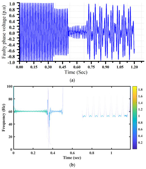 Due to the quasi-square waveform of the arc voltage, the faulty phase voltage contains the odd harmonics of the fundamental component. After the fault clearance, the values of these harmonics decrease and will ideally reach zero. The approaches presented in [4,5,6,7,8,9,10] calculated the harmonic content of the faulty phase voltage or healthy phase currents using various signal processing techniques including time-time (TT) transform, discrete wavelet transform, wavelet packet, and total harmonic distortion (THD). Finally, the fault nature and the moment of extinction of the secondary arc were detected using the calculated criterion values and changings. In the presence of renewable resources, the value of THD is always greater than zero, and this disrupts the performance of such methods.