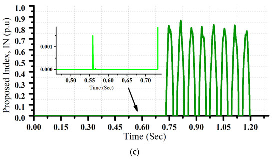Figure 5a shows the faulty phase voltage at Bus 2 for the single line to ground fault at 30% of the line. The Xsh and Xn of the inductively grounded shunt compensators at each side of the lines were 2380.60 and 461.42 Ω, respectively. Fundamental voltage magnitude fluctuations cause energy spreadation in low frequency components on the most signal processing methods. The HHT method adaptively distinguishes between fundamental voltage magnitude fluctuations and the presence of a low frequency component, therefore the spectrum extracted from the sub-synchronous components receives the least effect from the fundamental component. During the secondary arc, due to the reduction of the fault current, the length of the arc fluctuates more, and as a result, the voltage of the faulty phase fluctuates severely (Figure 5a). As demonstrated in Figure 5b, the proposed criterion is independent of the arc behavior and the IN value is zero during the secondary arc. This is due to the use of and the excellent ability of HHT to decompose signal components with minimal spectrum leakage. Similar waveforms of field measurements, obtained from electrical systems reported in [37], showed similar voltage behavior, hence, it is important that the secondary arc extinction detection method is independent of the voltage behavior during the dead-time.