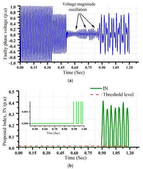 Faulty phase voltage oscillation during the secondary arc. (a) Faulted phase voltage waveform (p.u.). (b) Proposed index, IN (p.u.).