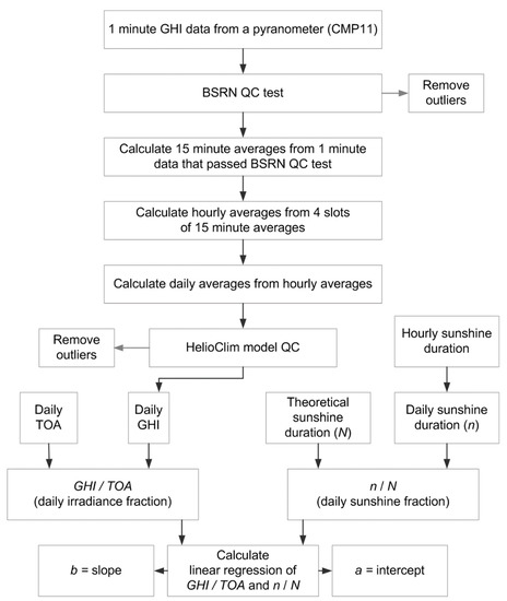 The methodology is provided in the flowchart in Figure 2 and Figure 3. Daily GHI data were calculated from 1-min GHI data. First, the 1-min GHI data were quality controlled using a Baseline Solar Radiation Network (BSRN) quality control (QC) procedure outlined by Long and Dutton in [21]. GHI values that failed the QC test were regarded as outliers and were discarded; only the data that passed the test were used [6,7,20,21,22]. Minute values that passed the BSRN QC were averaged to 15 min and then, 4 slots of 15-min averages were averaged to obtain an hourly mean [6,7,22,23,24,25]. Hourly mean values were then averaged to obtain daily average values. Daily average values were further quality checked by subjecting them to HelioClim model QC, described by Geiger et al. in [26]; outliers, which were daily average points coded 1, were discarded before further analysis.