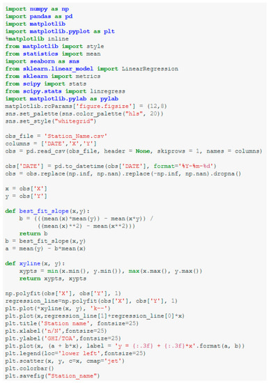 Further research will focus on extended monitoring of the stability of the coefficients over time in each climate zone. Further research will also focus on calibrating and validating rainfall, cloud, temperature, and humidity-based models in areas where sunshine data are not recorded to make sure that daily global solar radiation data can be estimated in those areas in South Africa. The Python script used in calculating linear regression coefficients and validation of observation and estimated GHI data is available on request from the correspondence author.