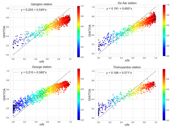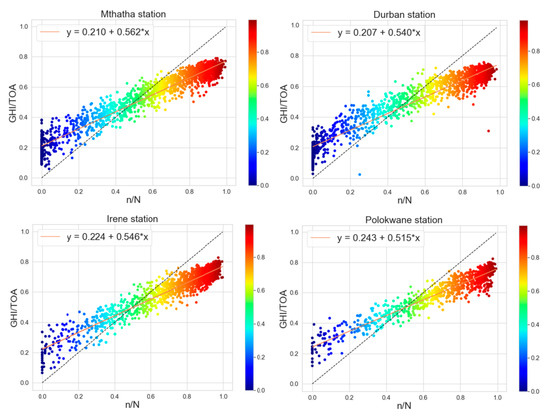 Regression lines and AP (the Ångström–Prescott) coefficients for Upington station (top left), De Aar (top right), George (bottom left), and Thohoyandou (bottom right).