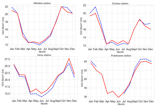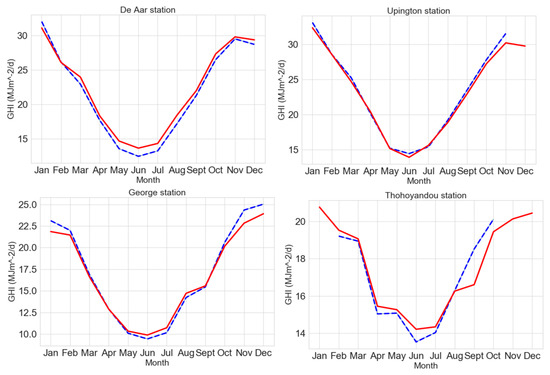 Comparison between measured and predicted monthly GHI values in De Aar (top left), Upington (top right), George (bottom left), and Thohoyandou (bottom right). Blue dotted line represents observed, GHI red solid line represents estimated GHI.