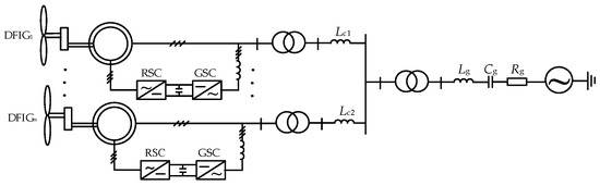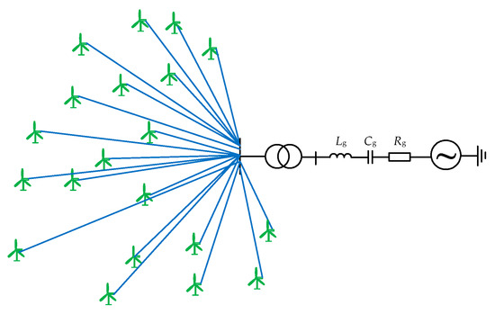 The structure of DFIG wind farm connected with the series compensated transmission network is shown in Figure 1. At first, the DFIG wind farm (multiple DFIG turbines with a capacity of 1.5 MW) is stepped up by a transformer and connected to the point of common coupling (PCC) in a radial manner, then stepped up again by the transformer and finally connected to the 500 kV system through a compensated transmission. In Figure 1, Rg, Lg and Cg are the resistance, inductance and series compensation capacitor of the transmission line respectively, Lc is the inductance between the DFIG turbines and PCC.