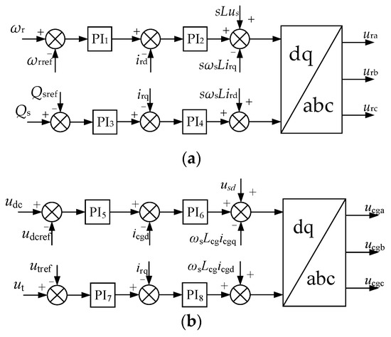 The control system adopts the decoupling control in dq axis based on the terminal voltage vector orientation, in which RSC adjusts the rotor speed according to the actual wind speed and keeps the reactive power output of the generator to 0. The control strategy of RSC is shown in Figure 2a.