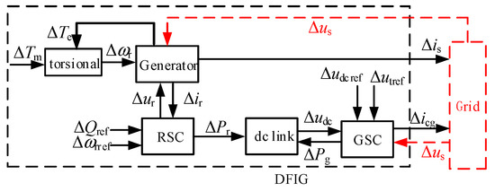 where AU and AL represent the coupling relationship between internal variables of DFIG and grid, BU and BI represent the interface relationship of voltage and current between DFIG and grid respectively. The List of matrices notations is shown in Table A2 in Appendix A.