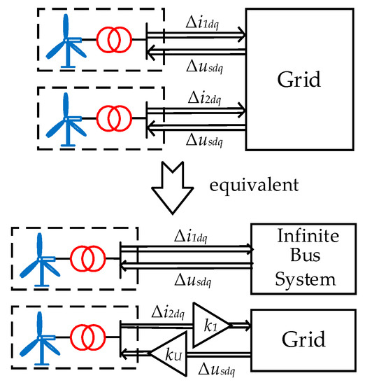 Therefore, the two-machine system can be equivalent, as shown in Figure 4. Among them, single-machine to the infinite bus can reflect the oscillation modes in DFIG turbines, while the modified single-machine to the grid can reflect the oscillation modes between DFIG turbines and the grid. Since it is always stable to single-machine to the infinite bus, the system’s stability under SSR only depends on the single-machine to grid.