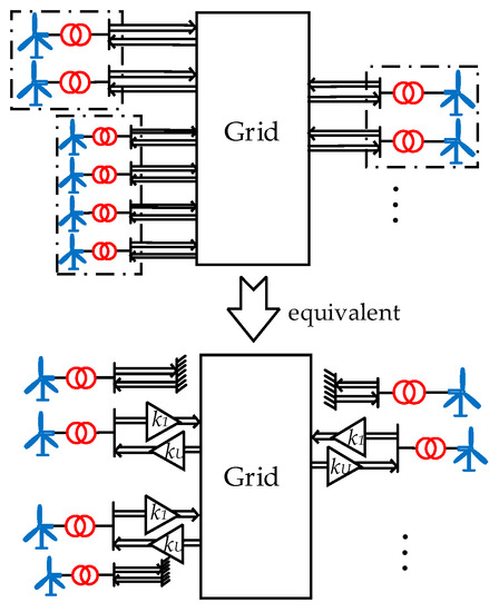 DFIG wind farm consists of hundreds of wind turbines generally. DFIG turbines are difficult to under the same operating conditions due to different position and influence of the wake effect, which cannot meet the equivalent conditions. At this point, DFIG wind farm can be divided into several groups composed of DFIG turbines with similar operating conditions. Hence each group’s DFIG turbines are approximately equivalent to the same operating conditions, each group can be equivalent to two separate units; otherwise, different groups cannot be equivalent. The equivalent model of DFIG wind farm is shown in Figure 5.