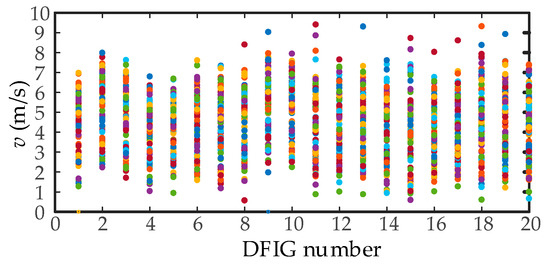To verify the accuracy of the theoretical analysis, a linearized model of a DFIG wind farm connected with series compensated transmission network as shown in Figure 6 has built, in which DFIG wind farm is characterized by 20 parallel DFIG turbines (the multiplier of each turbine is 100). The 24 h actual wind speed data of 20 wind turbines in a Jilin wind farm is shown in Figure 7 (the sampling interval is 15 min). The actual wind speed data at a certain time t1 is selected as the input wind speed of DFIG wind farm, as shown in Table A3 in Appendix B.